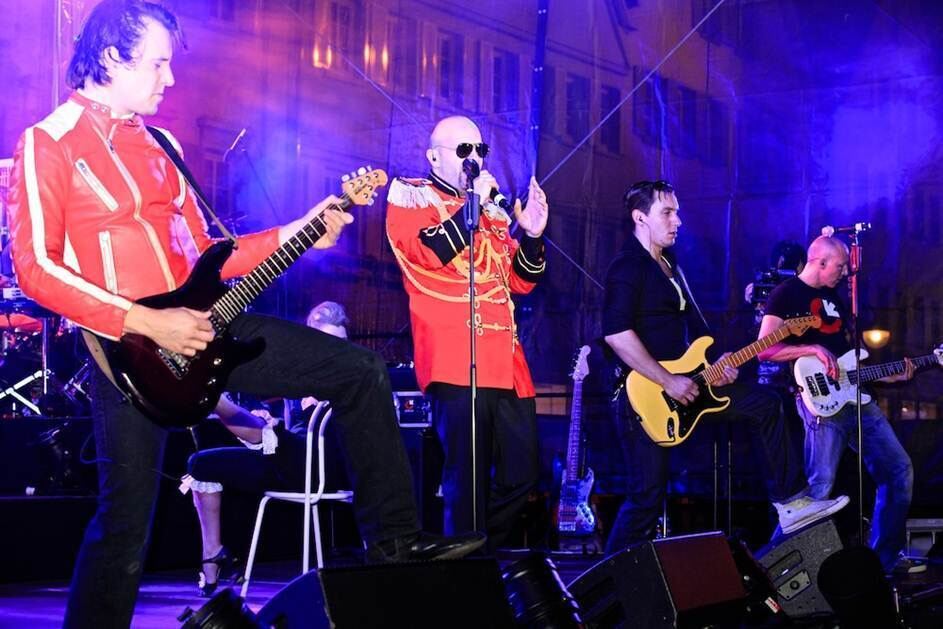 In Glitzeruniform macht Dominik Kuhn einen auf Falco. Links Gitarrist und Sänger Michael Strobel, rechts Gitarrist Ben Steiner und Bassist Wieland Braunschweiger.