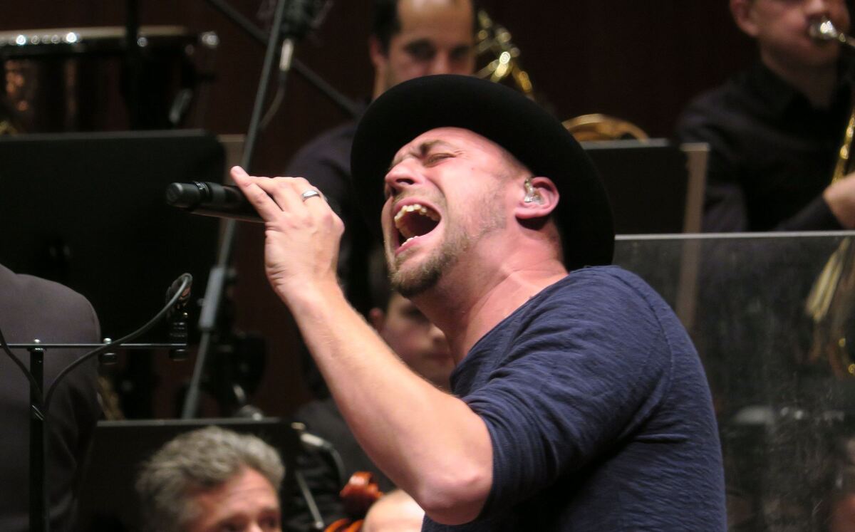 Max Mutzke legt sich beim Konzert mit der Philharmonie in der Stadthalle mit voller Energie in eine Soulballade. FOTO: KNAUER