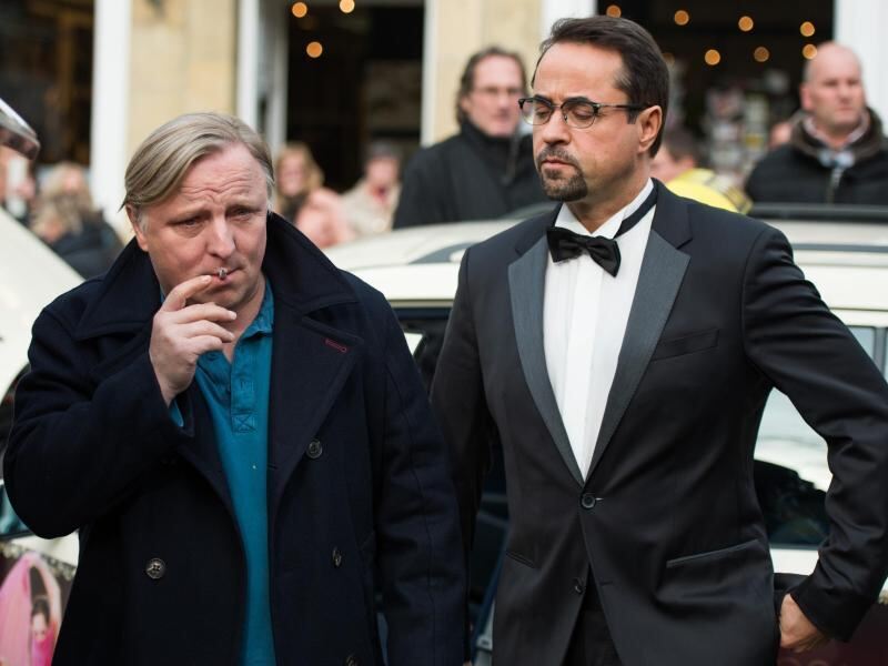 Axel Prahl (als Kommissar Frank Thiel, l) und Jan Josef Liefers (als Prof. Karl-Friedrich Boerne) bei Dreharbeiten der »Tatort«-Folge »Erkläre Chimäre«. Foto: Bernd Thissen