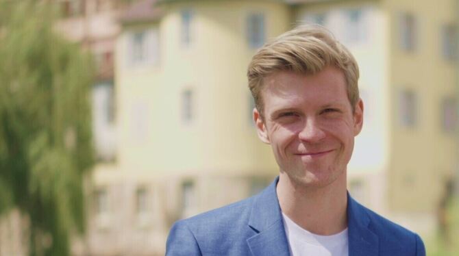 Justin Hibbeler als fiktiver Kulturmanager, der Turm hinter ihm steht noch.
