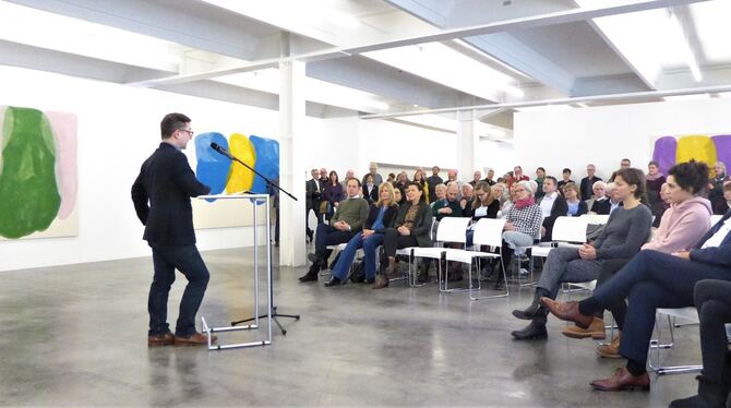 Links: Christian Malycha in der Galerie des Reutlinger Kunstvereins vor der Farbfeld-Malerei Tamina Amadyars. Rechts: Readymade von Michail Pirgelis. FOTOS: BERNKLAU