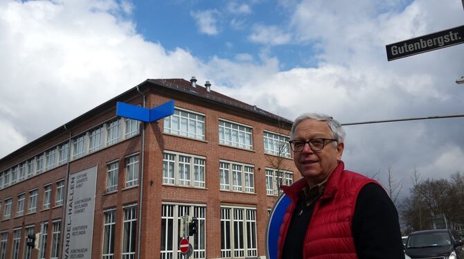 Nikolaus Koliusis vor den Wandel-Hallen, an denen oben vor der Etage des Kunstmuseums/konkret seine blaue Lichtinstallation »von – bis – hier« angebracht ist. FOTO: KNAUER