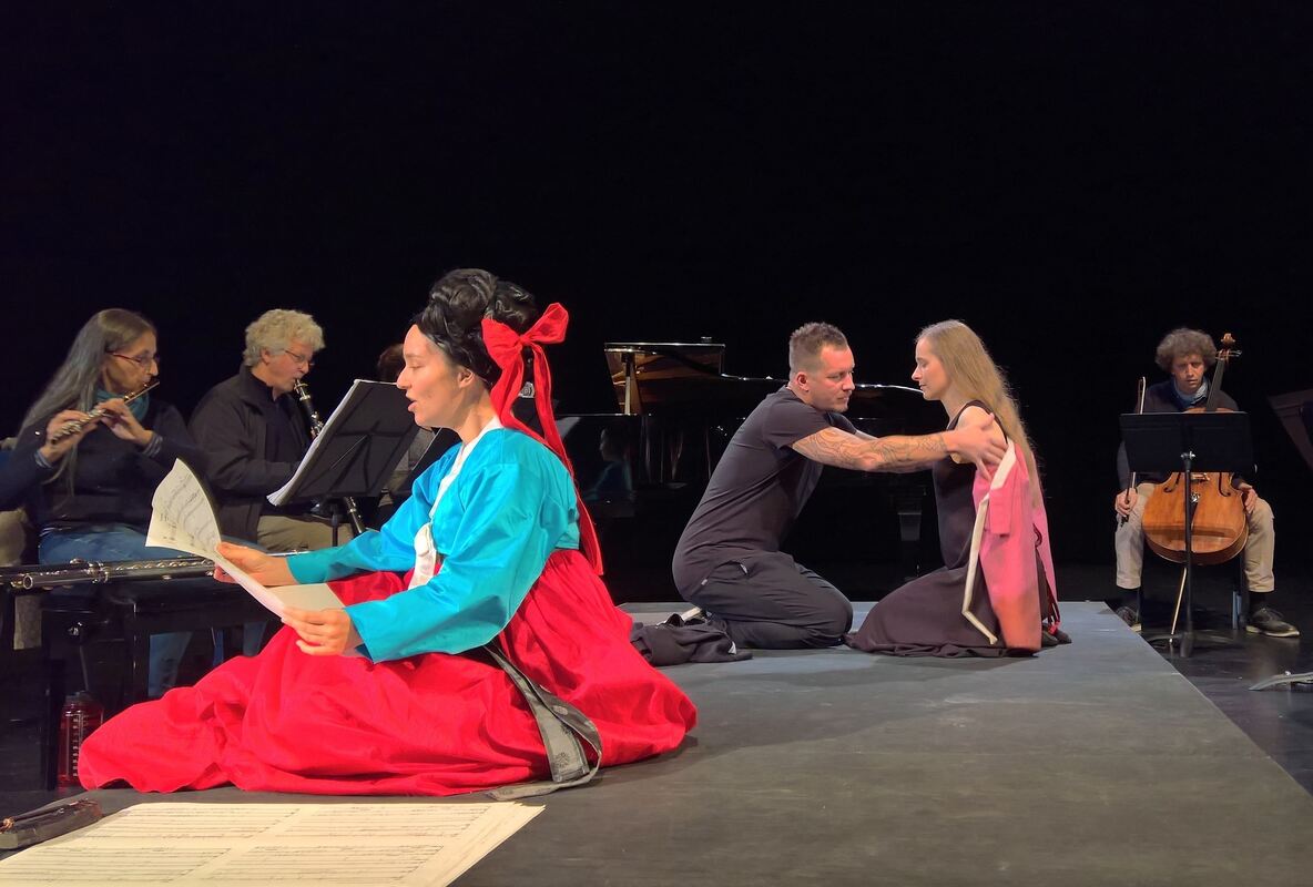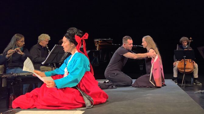 Hanna Herfurtner, Rita Wiesner, Mark Reich und das Ensemble Phorminx in einer Szene aus »BirnenBlütenRegen«. FOTO: STÜTZEL