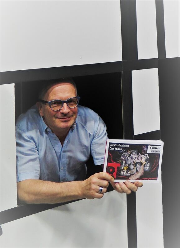 Enrico Urbanek, Intendant des Reutlinger Theaters Die Tonne, in der Sommertheater-Kulisse von »Romulus der Große« mit dem druckfrischen neuen Spielzeitheft. FOTO: STRÖHLE