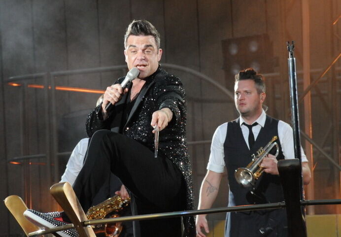 STUTTGART. Der abgebrühteste James-Bond-Regisseur hätte es kaum besser machen können. Schwefelgelbe Nebelschwaden wabern über das Fußballfeld der Mercedes-Benz-Arena in Stuttgart und hüllen 45 000 Menschen ein. Auftritt Robbie Williams. Der Engländer kommt nicht auf die Bühne. Er fliegt. Zumindest fast. An einer Drahtseilkonstruktion schwebt er vom höchsten Punkt des Stadiondachs ein, einen Schweif aus pinkfarbenem Bühnennebel hinter und jubelnde Menschen unter sich.