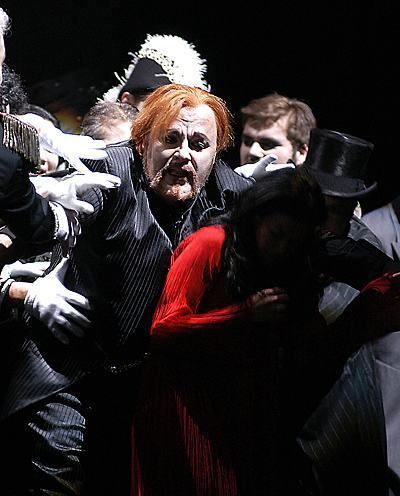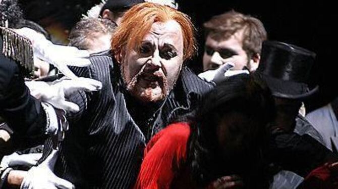 Der bösartige Hofnarr Rigoletto (Paolo Gavanelli, Mitte) will seine Tochter Gilda (Iride Martinez) aus den Fängen der Hofschranzen befreien. Eine Szene aus Philippe Arlauds Inszenierung der Verdi-Oper bei den Pfingstfestspielen in Baden-Baden.