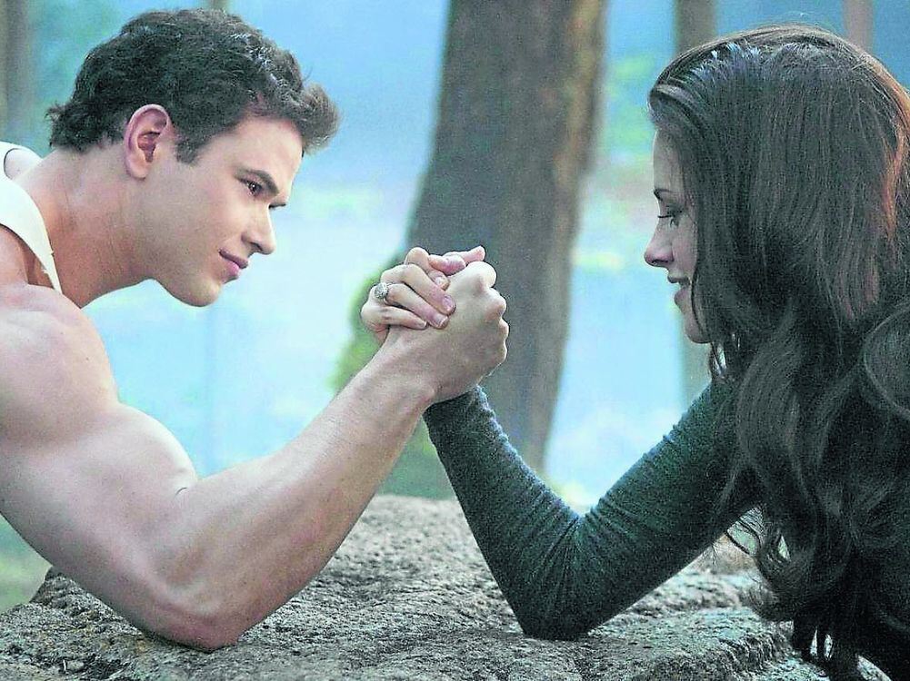 Beeindruckender Bizeps: Jungvampirin Bella (Kristen Stewart) im Armdrück-Duell mit Emmett (Kellan Lutz). FOTO: CONCORDE FILMVERLEIH