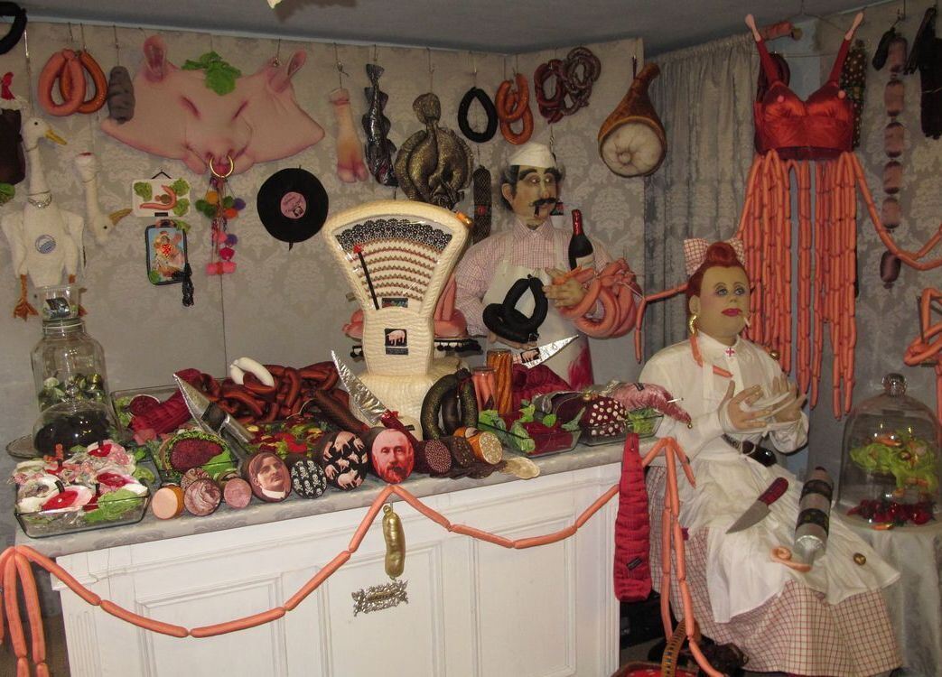 Kopfsalat mit Fingerschnecken, ein Schwein, das nie geschlachtet werden wird und zwei Bayerinnen beim Weißwurst-Wettessen.In Alraunes wundersamer genähter Metzgerei hat der Wurstanschnitt Gesichter und finden Saitenwürstchen Verwendung als Cocktailkleid. FOTOS: LANG
