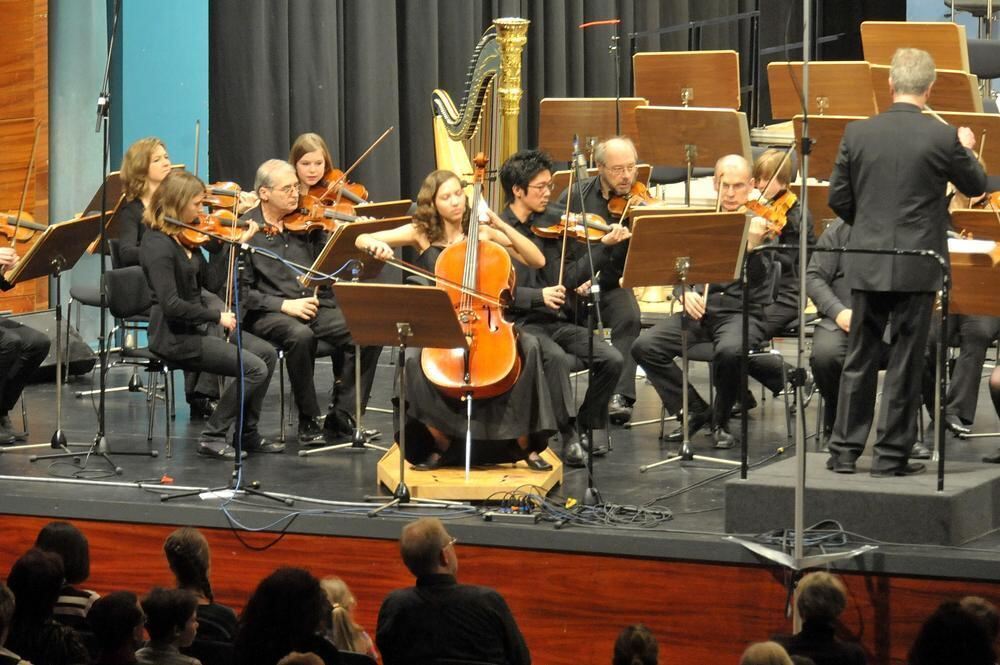 Jung-Cellistin Karima Albrecht im Zusammenspiel mit Musikern der Philharmonie und Musikschul-Kollegen.