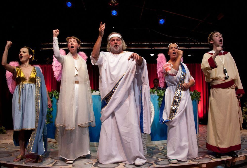 Am Olymp lassen es die Unsterblichen krachen (von links): Yvonne Lachmann als Cupido, Wolfgang Bathke als Zeus und Heidrun Schweda als Nymphe Echo. FOTO: SCHULZE