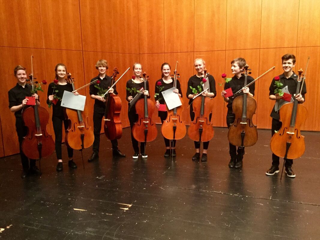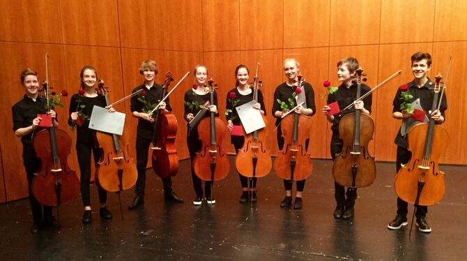 Das erfolgreiche Cello-Oktett mit Konstantin Arestov, Kathinka Beutel, Lena Freimann, Paul Hauser, Lionel Martin, Olga Rogowski, Anna Schneider und Joshua Wagner beim Preisträgerkonzert im Kronensaal. FOTO: PRIVAT