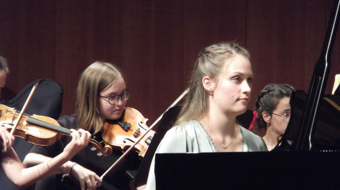 Pianistin Melinda Peschut, die Beethovens erstes Klavierkonzert spielte, und Mitglieder des Nachwuchsorchesters der Jungen Sinfonie Reutlingen in der Stadthalle.
