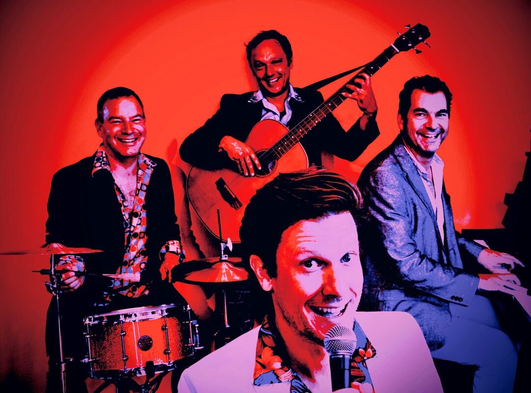 Jakob Nacken & die Toyboys auf einem Pressefoto. Vorne Sänger und Moderator Jakob Nacken, hinten von links Martin Buck, Schlagzeug, Julian Jochen-Warth, Bass, und Klaus Hügl, Klavier.