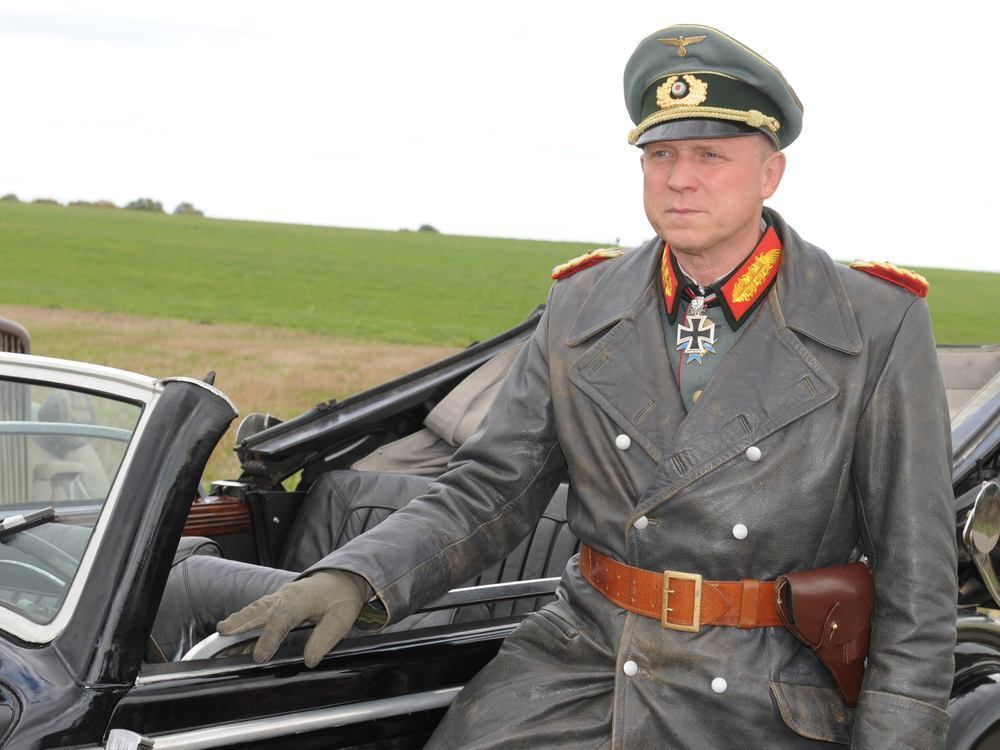 Die Schauspieler Ulrich Tukur (als Erwin Rommel) posiert 2011 in der Nähe von Römerstein-Böhringen auf der Schwäbischen Alb bei Dreharbeiten zum Film »Rommel« an einem Horch.