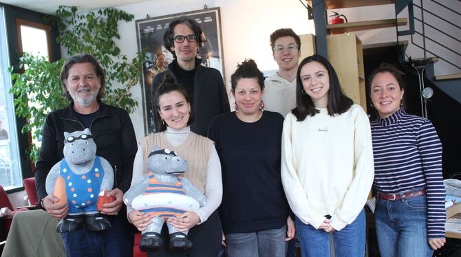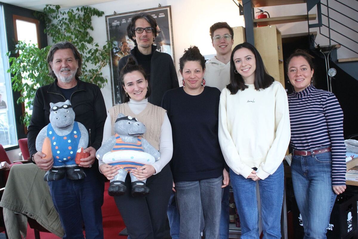 Das Festivalteam mit den beiden Nilpferd tragenden Leitern Paolo Roberto de Carvalho und Maria Vallecillos Soldado sowie Pressesprecher Yapác Manuel Kunze, Berenice Höntzsch, Eric Bodemer, Bianka Tovirac und Elena Suck.
