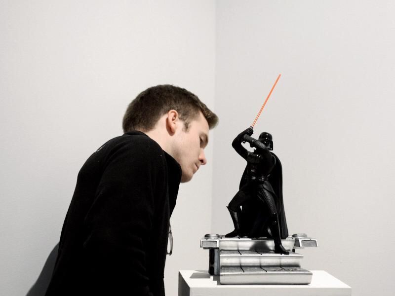 Ein Mann inspiziert in New York eine kleine Darth-Vader-Figur. Foto: Justin Lane