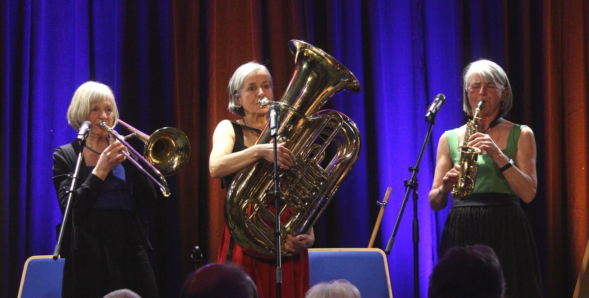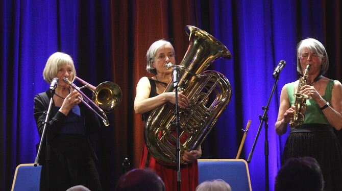 Die Wellküren Burgi, Bärbi und Moni (von links) bei den Reutlinger Mundart-Wochen, hier mit einer reinen Instrumentalnummer.