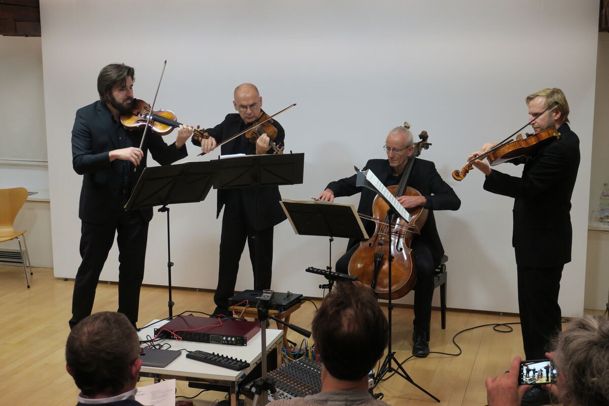 Den Beat in den Saiten, die Elektronik im Anschlag: Das Yellow String Quartet beim Auftritt im Kunstmuseum Spendhaus. Von links: Timo de Leo, Geige, Konrad Balik, Geige, Friedemann Dähn, Cello, und Benjamin Hartung, Bratsche. FOTO: KNAUER