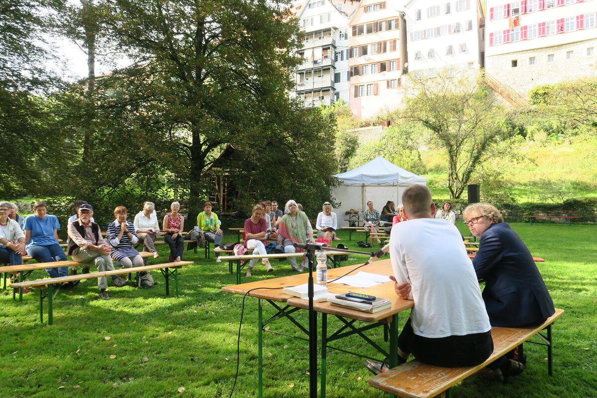 Im Stiftsgarten waren der belgische Lyriker Maarten Inghels (vorn, in Weiß) und sein Übersetzer Stefan Wiczorek zu erleben.