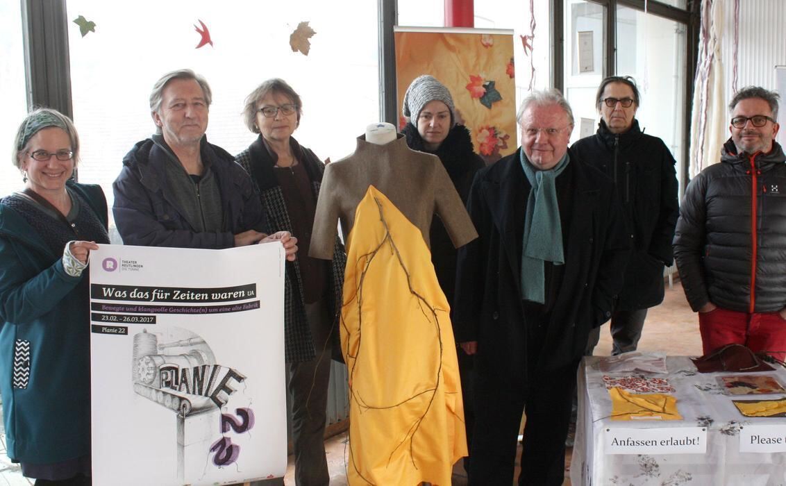 Beteiligte der Uraufführung »Was das für Zeiten waren«: Karen Schultze (von links), Bernd Wegener, Sabine Weißinger, Ilona Lenk, Wolfgang Rätz, Friedrich Förster und Enrico Urbanek. Vorn im Bild Arbeiten von Reutlinger Textil- und Designstudenten.