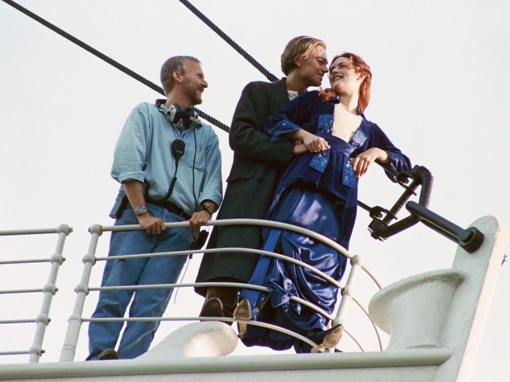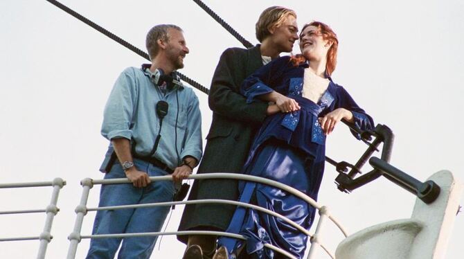 Regisseur James Cameron (links) mit den »Titanic«-Stars Leonardo DiCaprio und Kate Winslet am Schiffsbug. VERLEIHFOTO