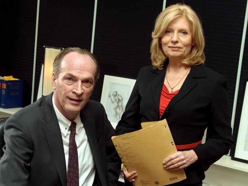 Herbert Knaup als Anwalt Markus Gellert und Sabine Postel als Isa von Brede bei einem Set-Termin zur Serie »Die Kanzlei«. Foto: Angelika Warmuth