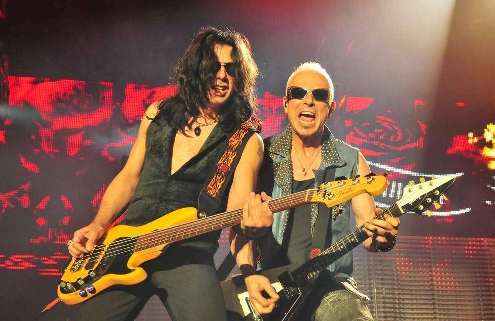 Ein Auftritt, wie er Spaß macht: Bassist Pawel Maciwoda und Gitarrist Rudolf Schenker lassen die Fetzen fliegen.