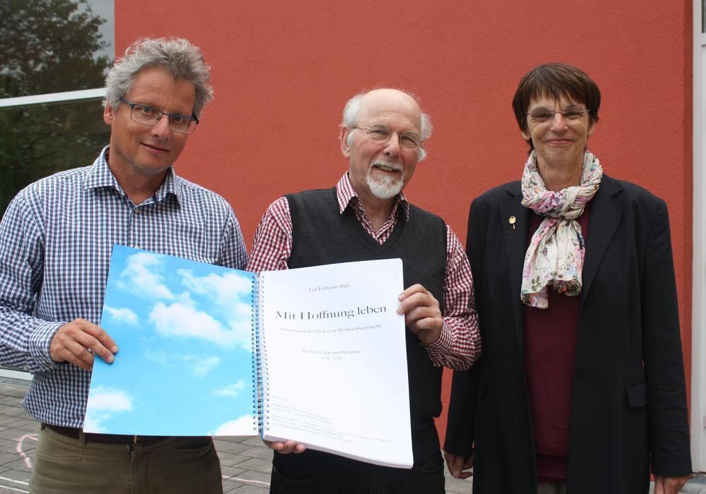 Chorleiter Wolfhard Witte (von links), Komponist Veit Erdmann-Abele und Kreuzkirchenpfarrerin Astrid Gilch-Messerer mit der Partitur von Erdmann-Abeles Weihnachtsoratorium.