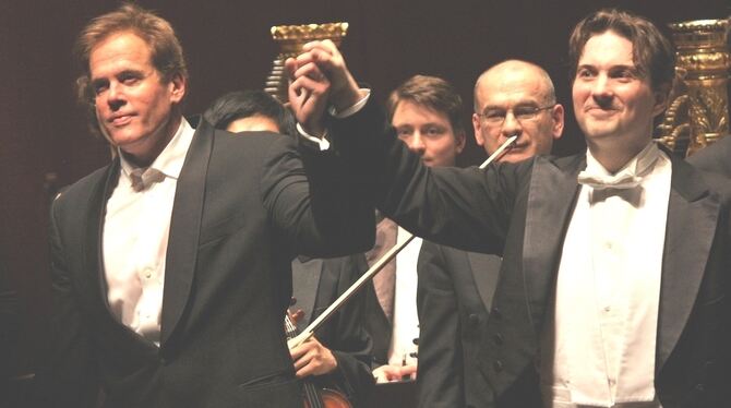 Pianist Tzimon Barto (links) und Gastdirigent Alexander Soddy genießen in der voll besetzten Reutlinger Stadthalle den überschäumenden Beifall. Beim sechsten Sinfoniekonzert dieser Spielzeit standen neben Liszts zweitem Klavierkonzert ausschließlich italienische Werke auf dem Programm.