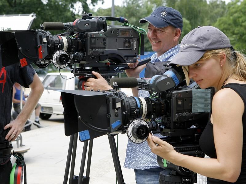 Zwei Kameraleute bei der Arbeit in Potsdam während eines Außendrehs. Foto: Bernd Settnik