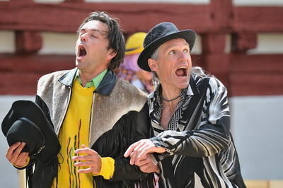 GOMARINGEN. »Volpone oder Der schlaue Herr Fuchs« nach Ben Jonson (1572-1637) in der schwäbischen Fassung von Hartwin Gromes und Felix Huby feierte am Donnerstagabend im malerischen Innenhof des Gomaringer Schlosses Premiere. Erneut ist das Melchinger Theater Lindenhof der Theatersommer- Partner der Gemeinde und bringt mit seinen ausgezeichneten Darstellern pralles Schauspiel auf die originelle Holzbühne, die Katrin Busching entworfen hat.