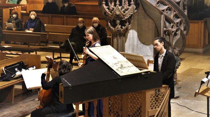 Von links: Anna Reisener (Gambe), Iris Maron (Barockvioline) und Julius Lorscheider (Cembalo/Truhenorgel) in der Stiftskirche. FOTO: VARADY