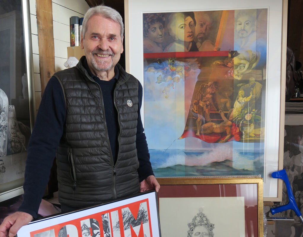 Der Künstler Hans-Joachim Madaus in seinem Atelier in seinem Haus in Walddorfhäslach mit eigenen Arbeiten und einem Ausstellungsplakat.