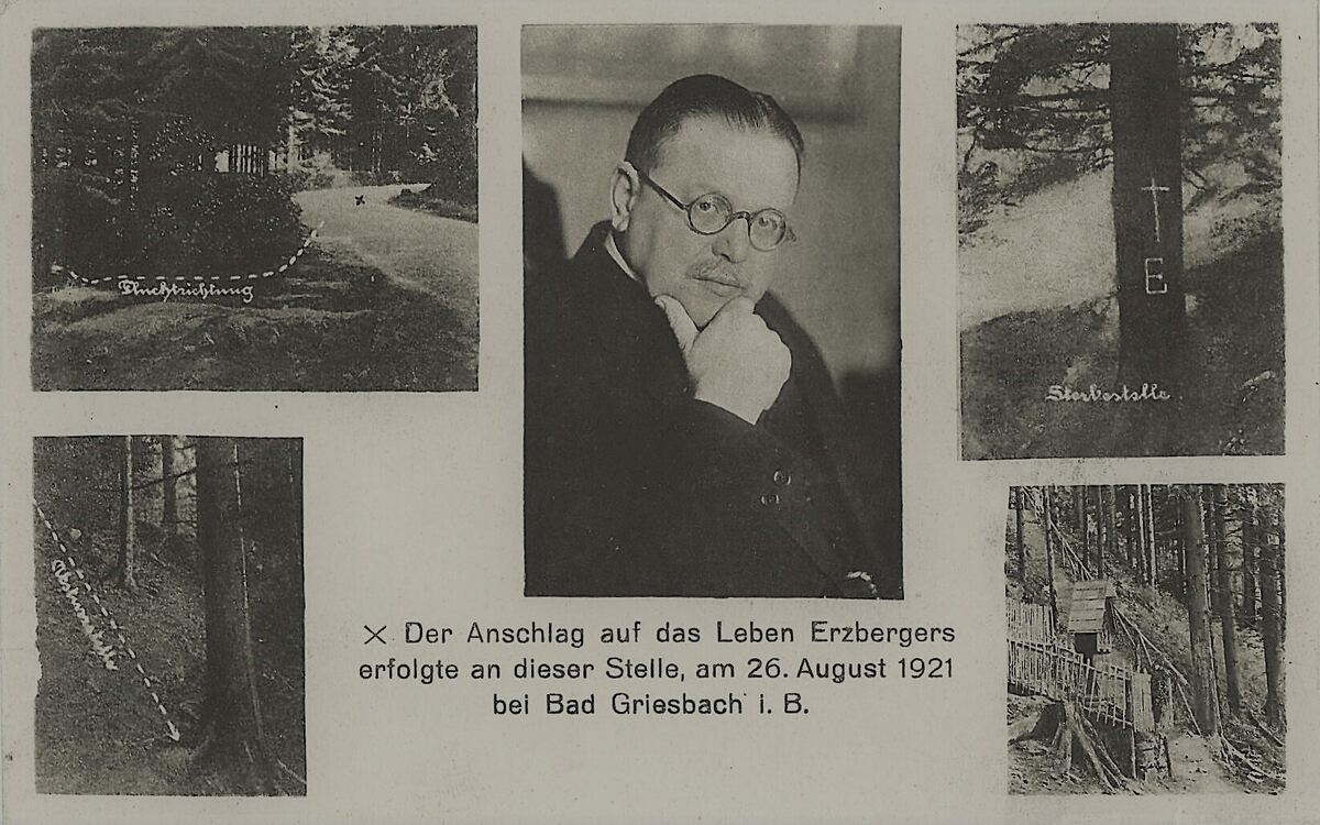 Eine Postkarte mit Fotos aus den 1920ern zeigt den Tatort des Erzberger-Mords am 26. August 1921. FOTOS: ANTON HUBER/SAMMLUNG RANDECKER