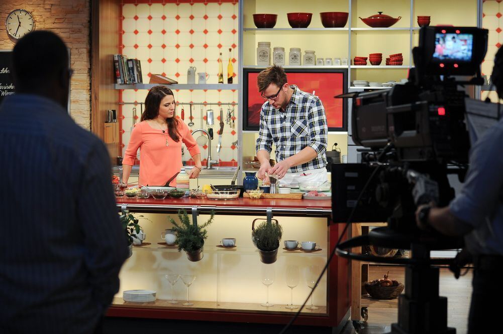 Moderatorin Fatma Mittler-Solak und Koch Sören Anders unterhalten sich während der Aufzeichnung der Sendung »ARD-Buffet« am 11. Dezember 2015 in einem Studio des Südwestrundfunks in Baden Baden. Foto Achim Keller/dpa