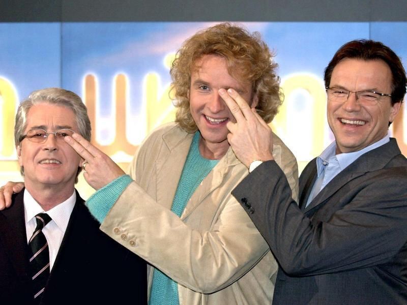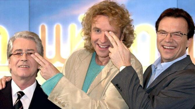 Die »Wetten, dass..?«-Moderatoren Frank Elstner, Thomas Gottschalk und Wolfgang Lippert (v.l.) posieren 2001 in Hamburg bei einer ZDF-Pressekonferenz. Foto: Kay Nietfeld/Archiv
