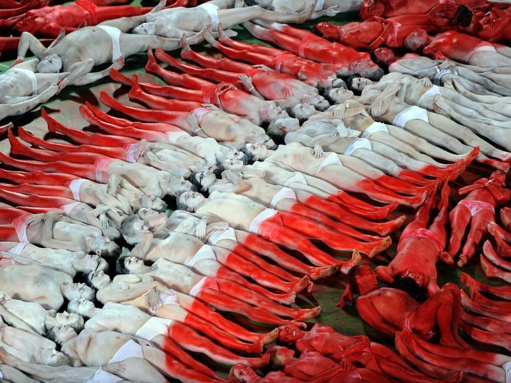 Ganz toll die Stadtwette: An die 500 Düsseldorfer stellen mit nackten Leibern (abgesehen vom Unterhöschen) - rot und weiß bemalt - das Emblem des Fußball-Bundesligaclubs Fortuna Düsseldorf nach.