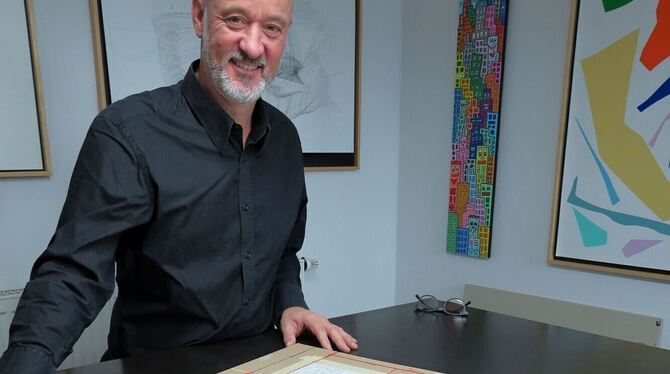 Graffiti-Geschäftsführer Sebastian Wendel mit einem Exemplar von Christos verhülltem Globus auf einer überarbeiteten Karton-Grundplatte. FOTO: KNAUER