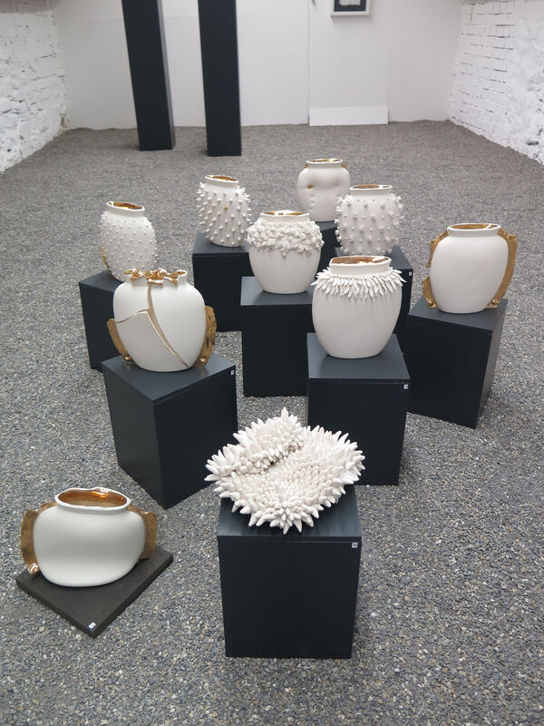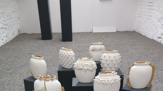 Aus Porzellan und Gold: Stachelobjekt und Vasenserie von Heidi Degenhardt. FOTO: STRÖHLE