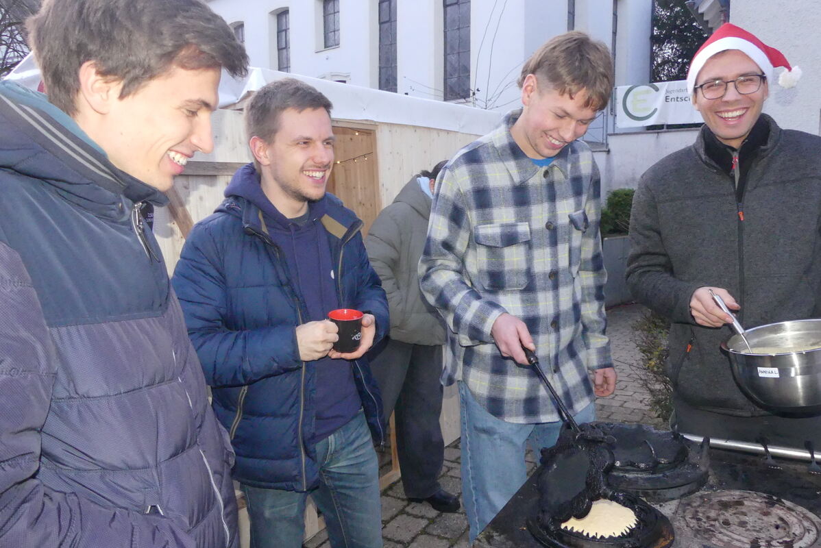 Dieses Mal gab es solche Waffeln zudem in Rübgarten, dem mit zwei Jahren jüngsten Weihnachtsmarkt. Hier war das evangelische Jugendarbeitsteam Waffelbäcker, während die »Churchies«, das Team der Kinderkirche, Kaiserschmarrn als Besonderheit anbot. Etwas Besonderes war auch die Beleuchtung der Kirche am Abend. Obendrein machte ein großer Feuertopf auf der Straße auf den Weihnachtsmarkt aufmerksam, der aus der Bevölkerung heraus entstanden ist, als Zeichen der großen Dorfgemeinschaft.