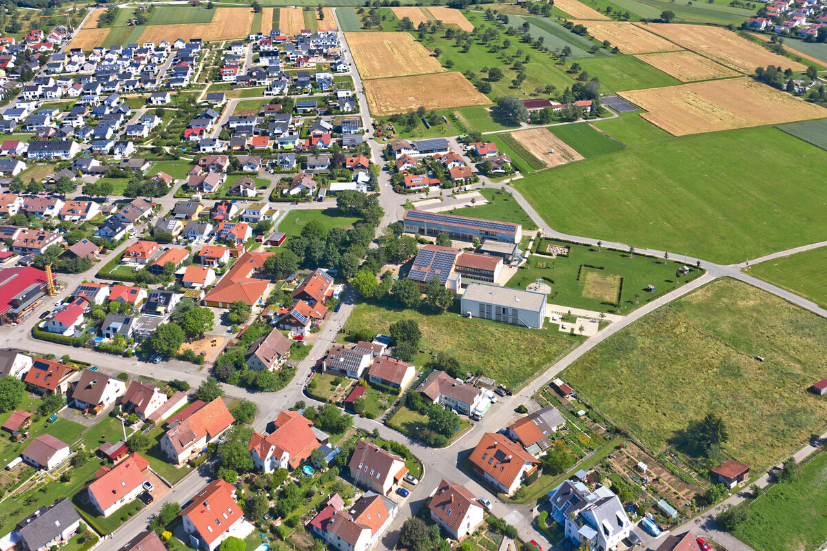 Die Gustav-Werner-Gemeinschaftsschule liegt am Ortsrand von Walddorf (Mitte rechts). Es gibt einen Konflikt um die inzwischen abmontierten Photovoltaikanlagen auf den Schuldächern.