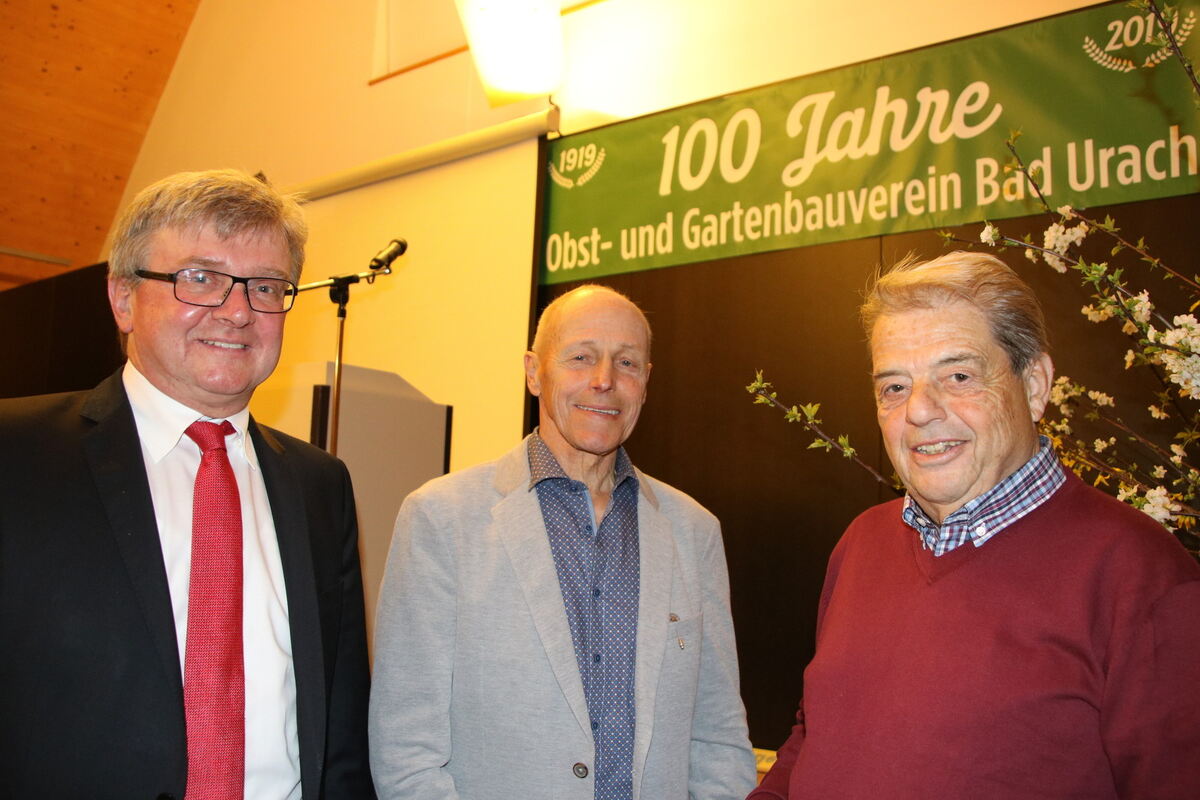 Bad Urachs Bürgermeister Elmar Rebmann ehrte die Vorstandsmitglieder des OGV Bad Urach, Fritz Bader und Günther Wurster (von links). TOTO: OECHSNER