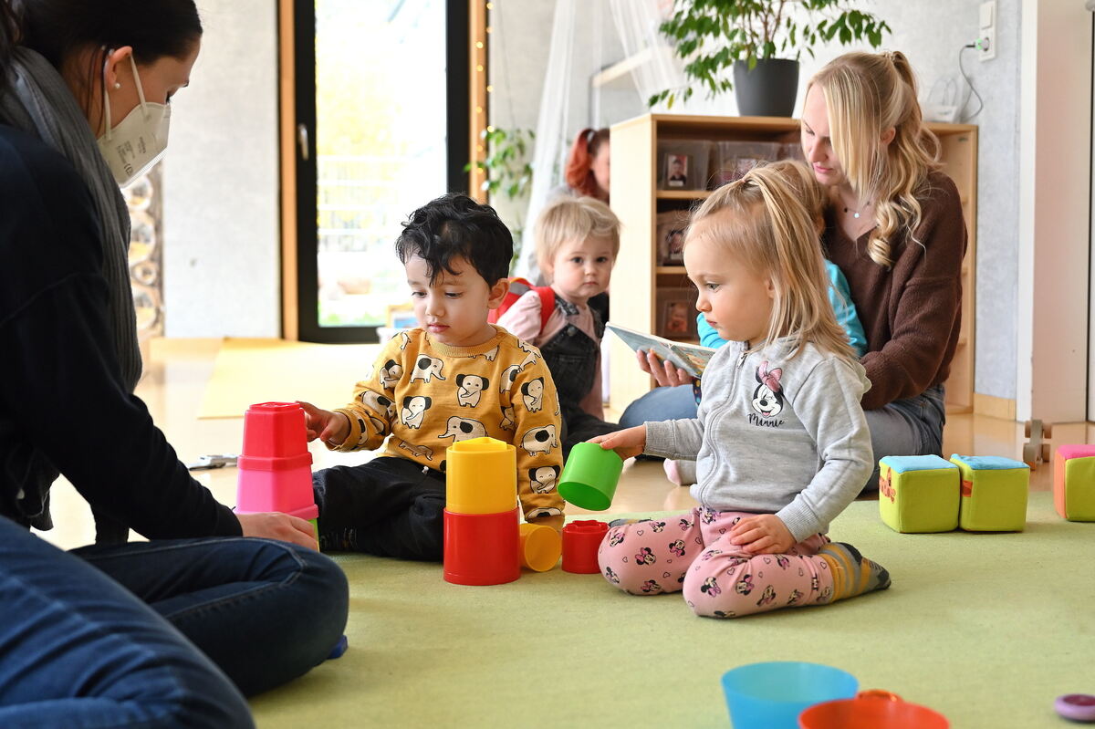Bunte Türmchen und eine Bilderbuchgeschichte: Kinder und zwei Erzieherinnen im Kinderhaus Hofbühl in Neuhausen. FOTO: PIETH