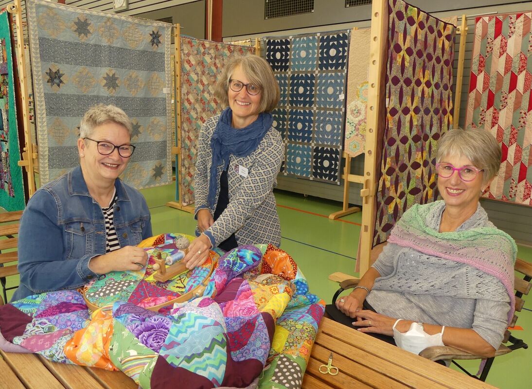 Bei der Hobbykunstausstellung in Walddorfhäslach zeigten (von links) Marianne Rössle, Petra Stierle und Claudia Zähringer von der Quilt-Werkstatt ihre farbenfrohen Werke. FOTO: SANDER