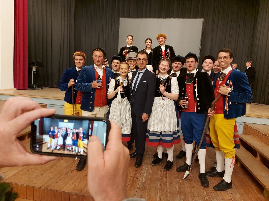 Festredner Cem Özdemir kam wegen der Verspätung seines Zugs zwar fast zwei Sunden später als geplant, nach der Veranstaltung aber kaum weg, so viele Menschen wollten mit dem prominenten Grünen-Politiker aus Bad Urach reden und Selfies machen – hier Mitglieder des Schäferreigens und der Schäferlies. FOTO: FINK