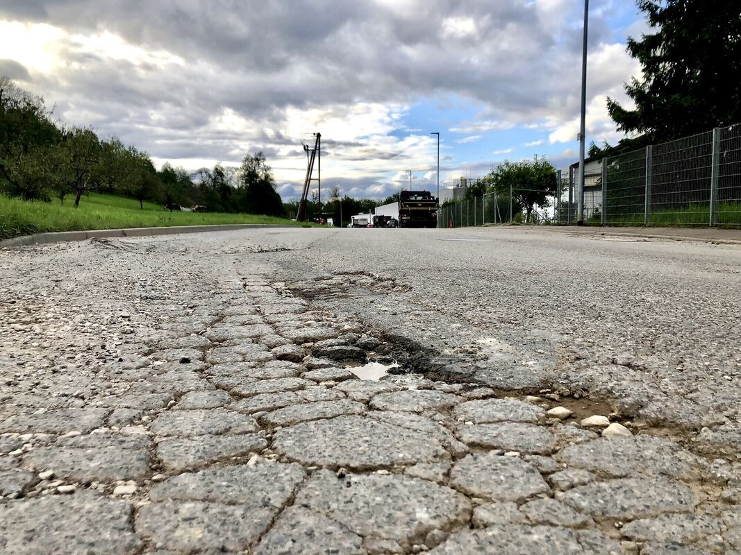 Großflächige Risse in der Fahrbahn und beschädigter Unterbau wie hier auf Höhe der Firma Vogel machen Sanierungsarbeiten in der Robert-Bosch-Straße notwendig. FOTO: LEIPOLD