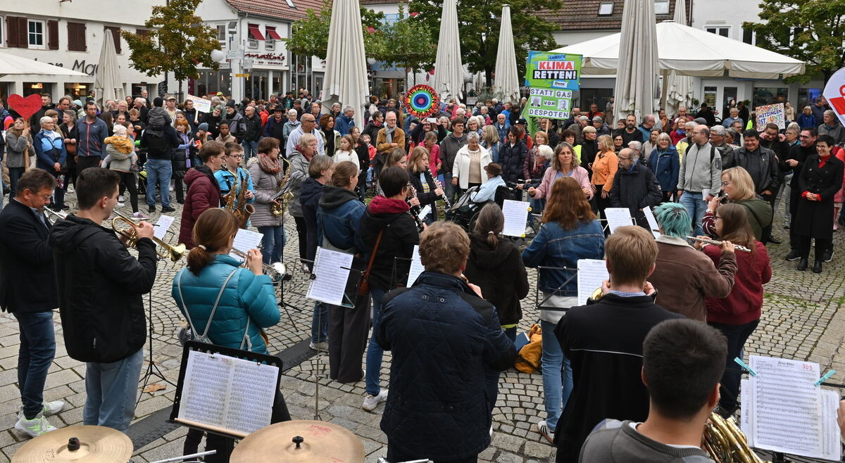 Auf dem Marktplatz kamen allerlei Bürger, darunter (vorne rechts) die Oberbürgermeisterin Carmen Haberstroh zusammen, um gegen die AfD Flagge zu zeigen. Im Vordergrund spielten die Stadtkapelle und der Musikverein Neuhausen.