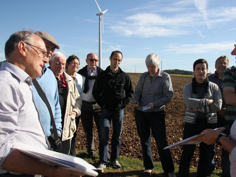 Station zwei der AKE-Exkursion: die Stettener Höhe mit Windkraftanlagen »aus der Steinzeit«.