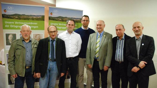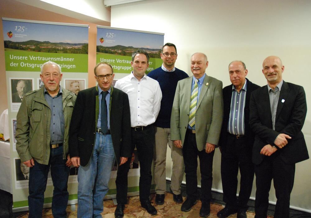 Die neue Albvereinsspitze mit Heiko Luz und Michael Hauser (Zweiter und Dritter von links), umgeben von den bisherigen Vorstandsmitgliedern Dietmar Bez, Wilhelm Mändle, Hans Bader und Mathias Koch von der Skizunft (von links). FOTO: STEIDLE