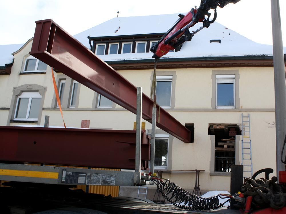 Präzisionsarbeit: Ein Kran bugsiert vier elf Meter lange und dreieinhalb Tonnen schwere Stahlträger ins Alte Schulhaus von Hülben. FOTO: GANSER